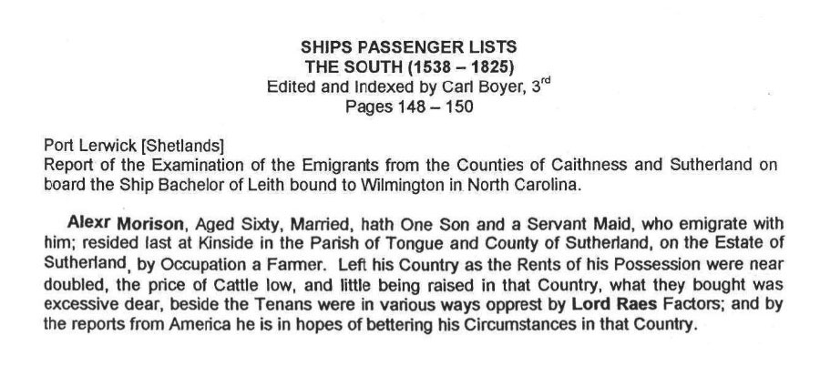 Alexr. Morison, Aged Sixty, Married, hath One Son and a Servant Maid, who emigrate with him; resided last at Kinside in the Parish of Tongue and County of Sutherland, on the Estate of Sutherland, by Occupation a Farmer. Left his Country as the Rents of his Possession were near doubled, the price of Cattle low, and little being raised in that Country, what they bought was excessive dear, beside the Tenans were in various ways opprest by Lord Raes Factors; and by the Reports from America he is in hopes of bettering his Circumstances in that Country.